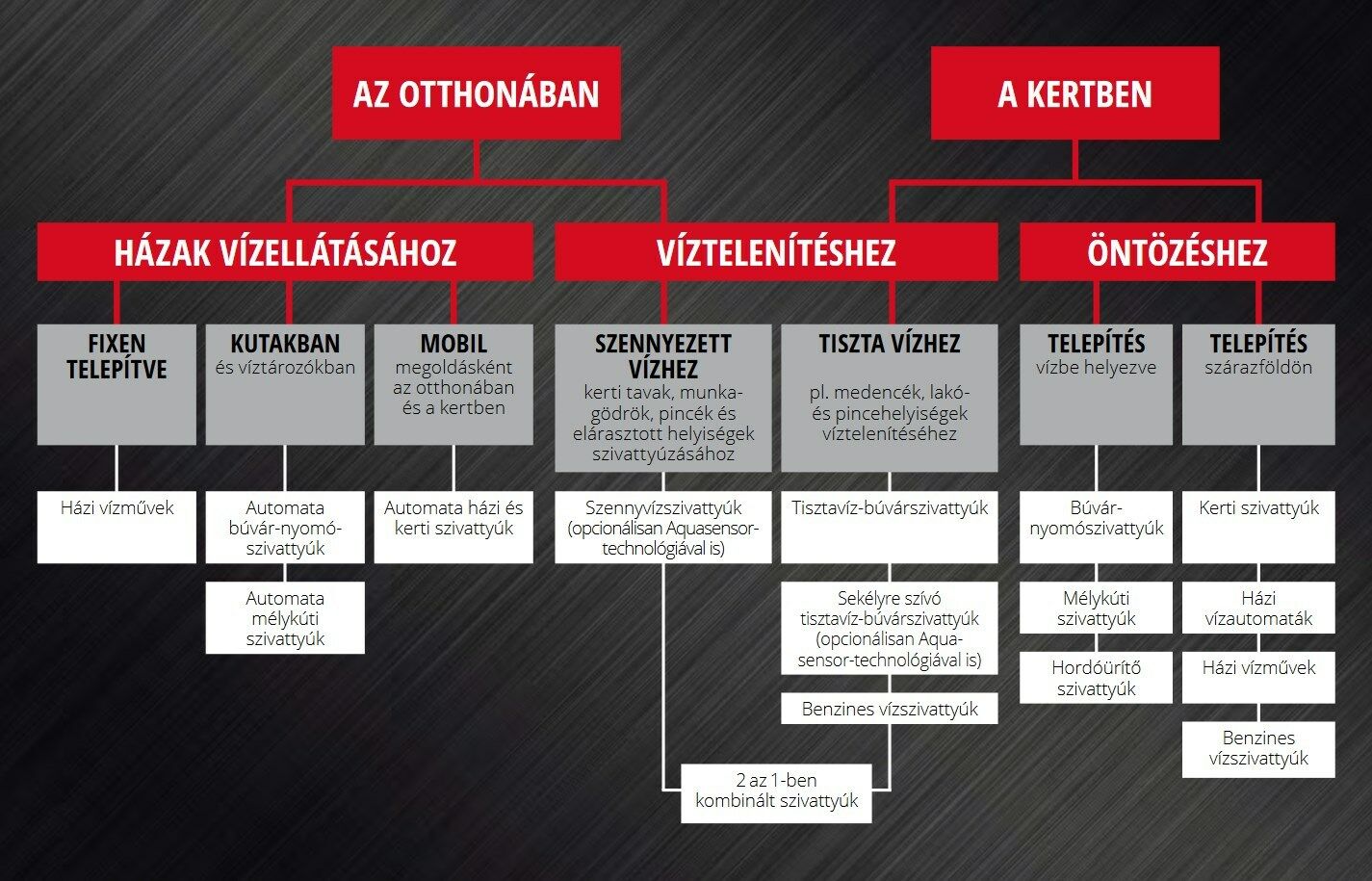 A búvárszivattyúkat két kategóriába sorolhatók. Az alkalmazási területtől és a szivattyúzandó víz szennyezettségi szintjétől függően tiszta- vagy szennyvízszivattyúk közül választhat. A búvárszivattyúk választékában olyan multifunkciós szivattyúkat is megtalál, amelyek tiszta -és szennyvízhez egyaránt használhatók; ezek az úgynevezett 2 az 1-ben kombinált szivattyúk. A bonyolultabb feladatok elvégzéséhez – például nagy mélységből vagy különösen nagy nyomáson történő szivattyúzáshoz – válassza mélykúti-, illetve búvár-nyomószivattyúink egyikét.
